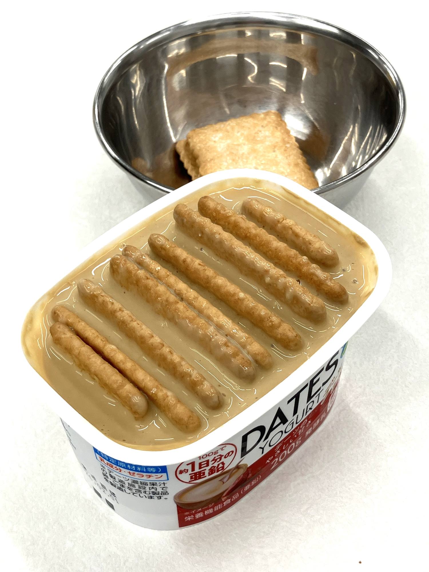 ボウルやホイッパーを使用しなくても、デーツヨーグルトの容器を使用して、簡単に仕込むことが